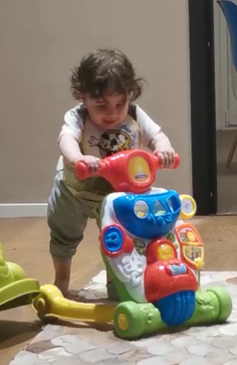Continui a trovare modi per impressionarmi con tutti i nuovi modi di esprimerti. Anche se ancora dici 2 parole in croce, hai già un enorme talento nel camminare con il tuo scooterino. Hai anche imparato a fare no con la testa.